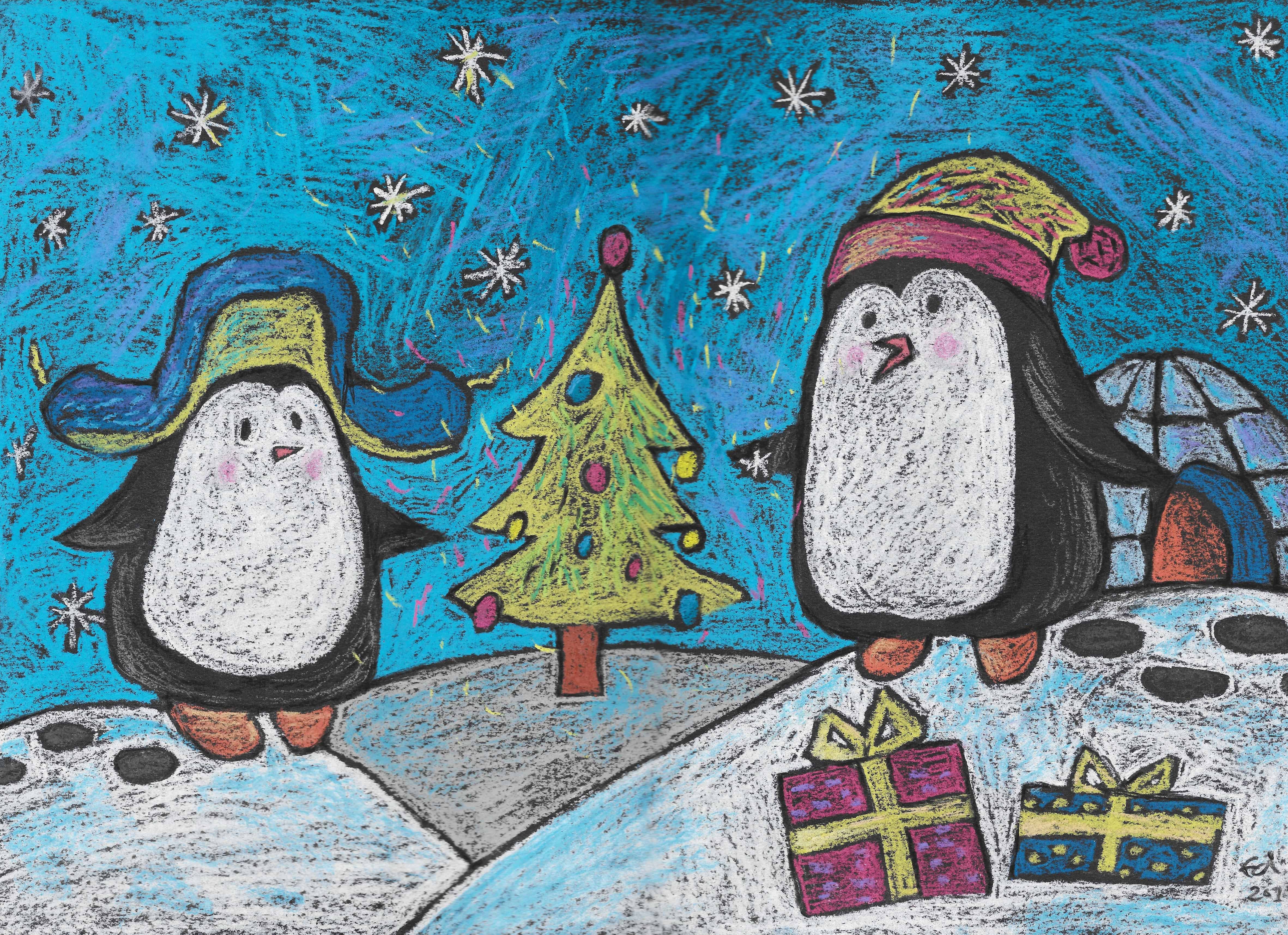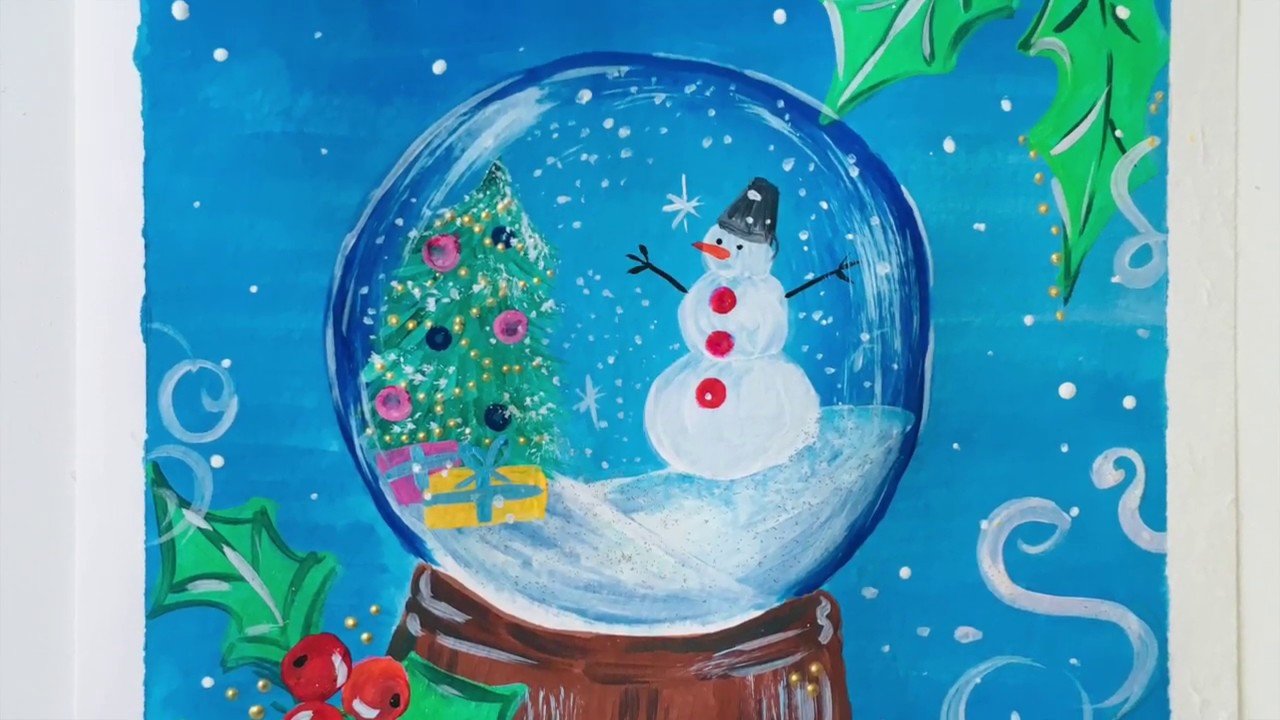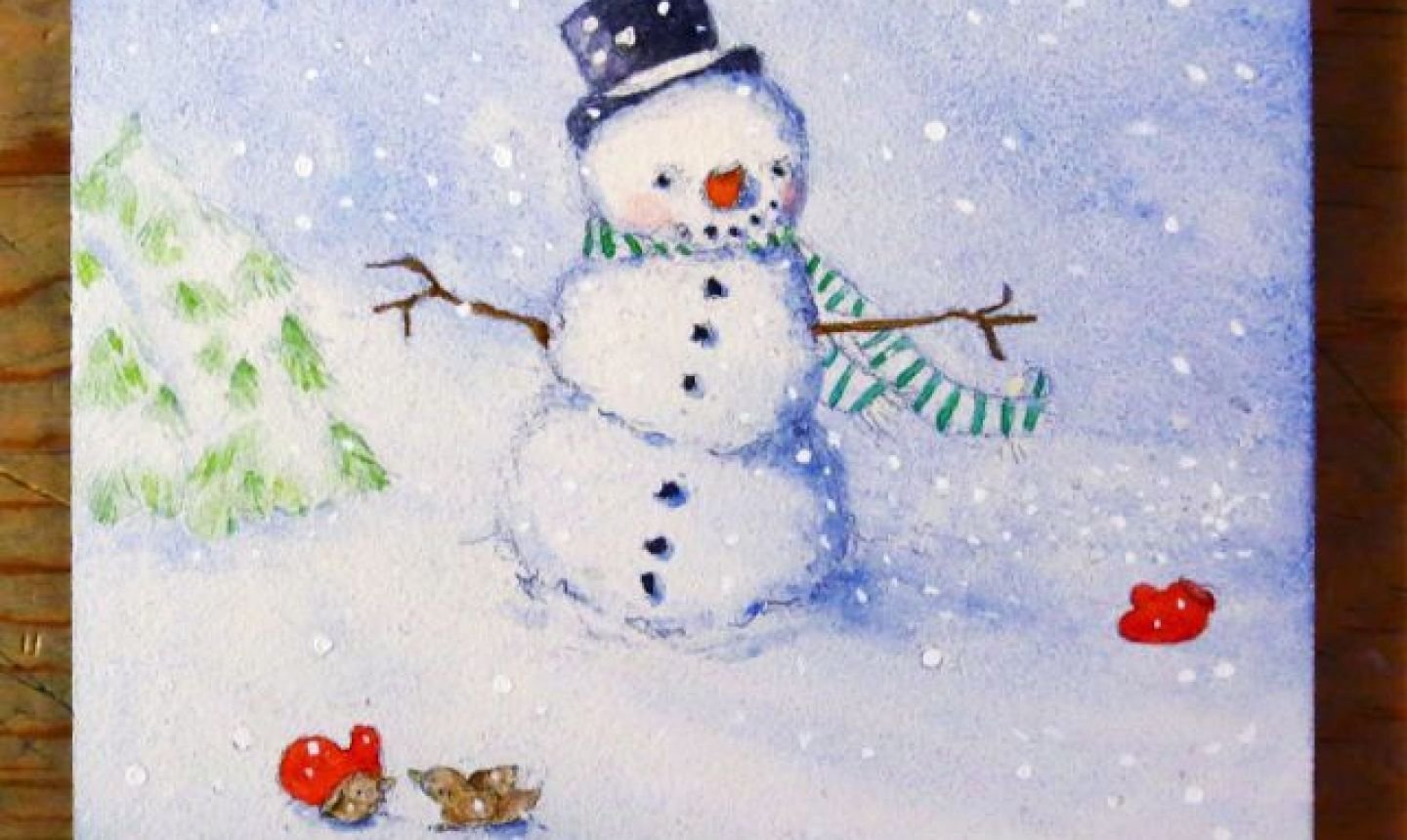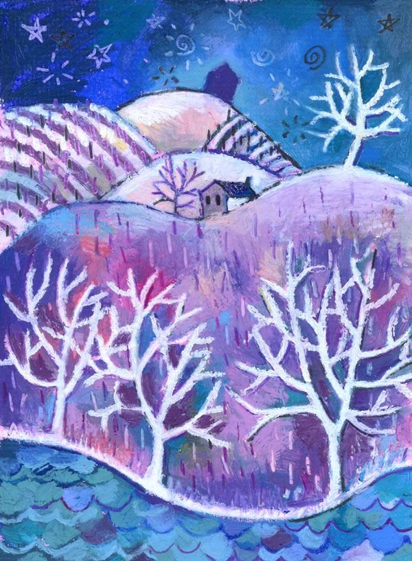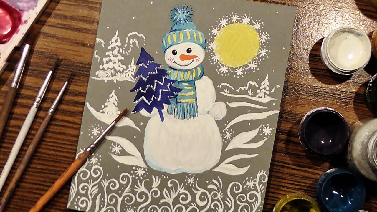 ![Зимний пейзаж белой гуашью на темном фоне]()