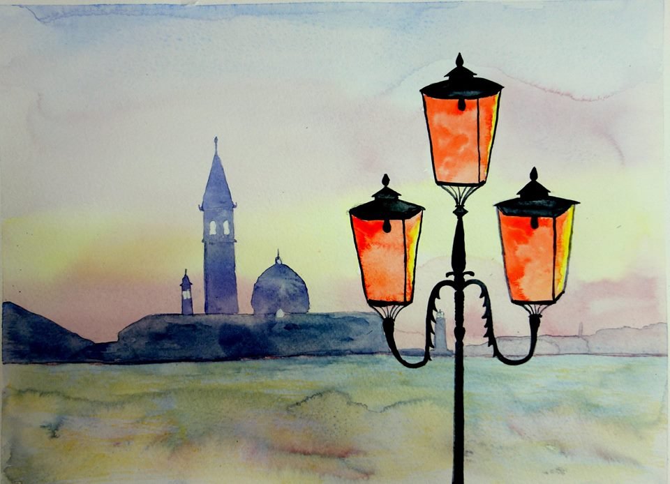 Закат акварельными красками