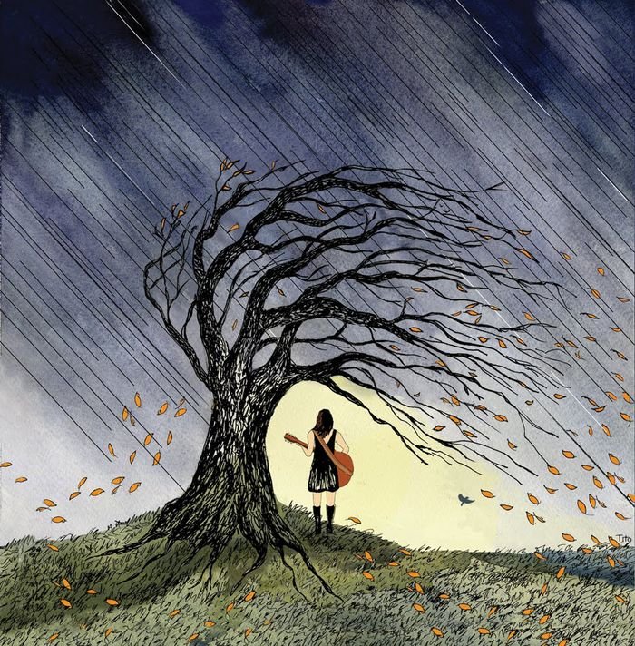 ![Девушка под дождем акварель]()