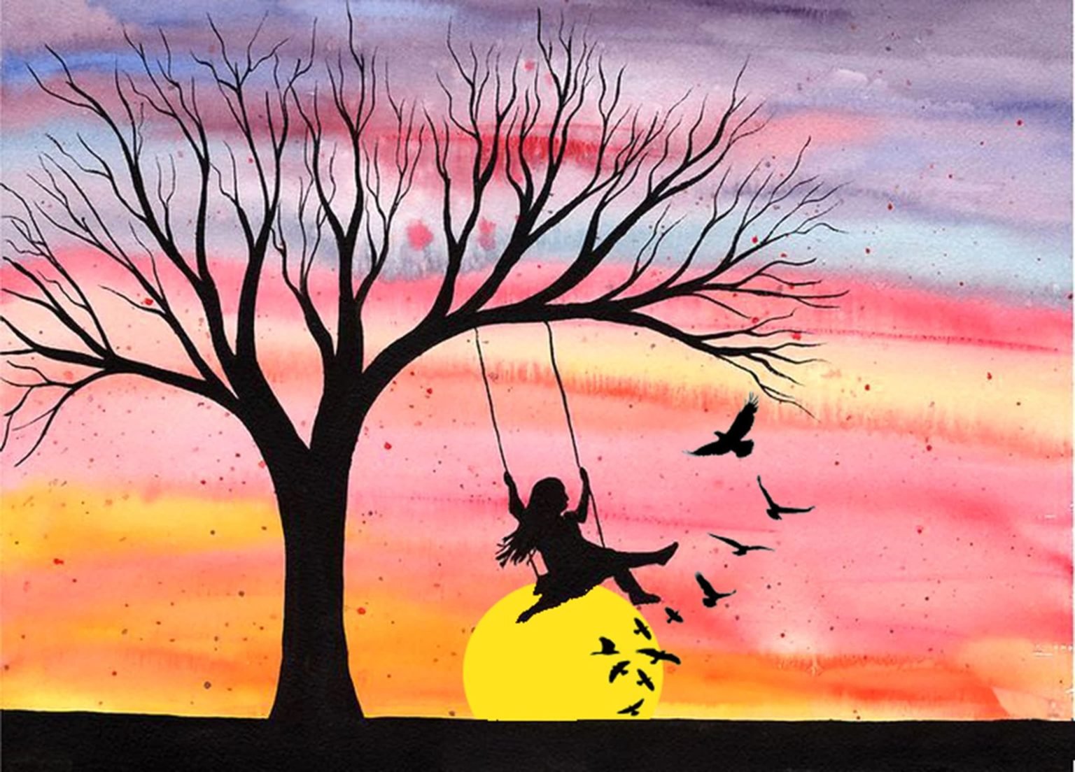 Силуэтный пейзаж акварелью