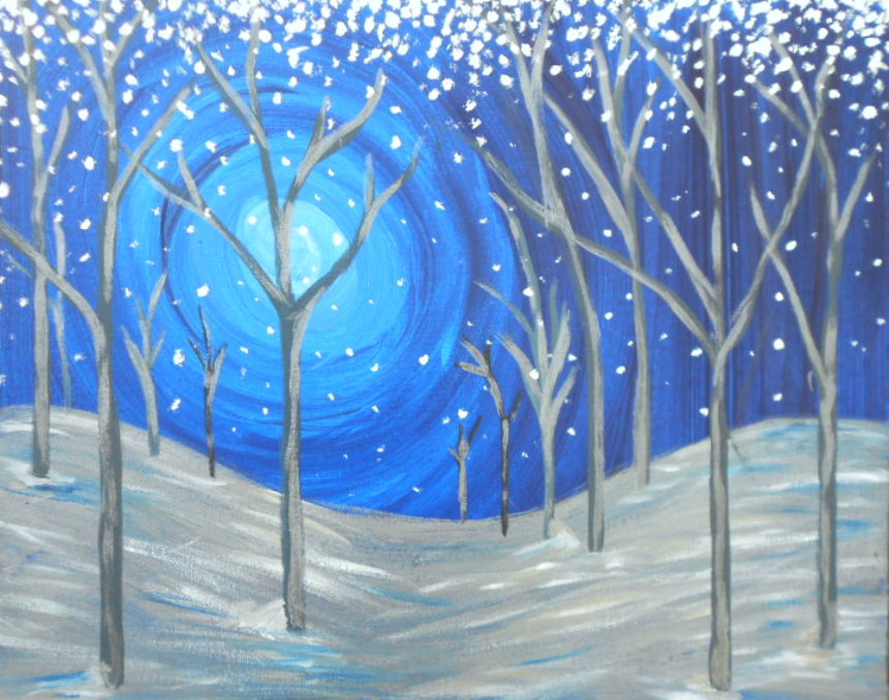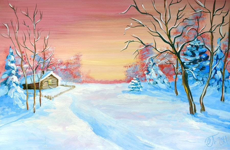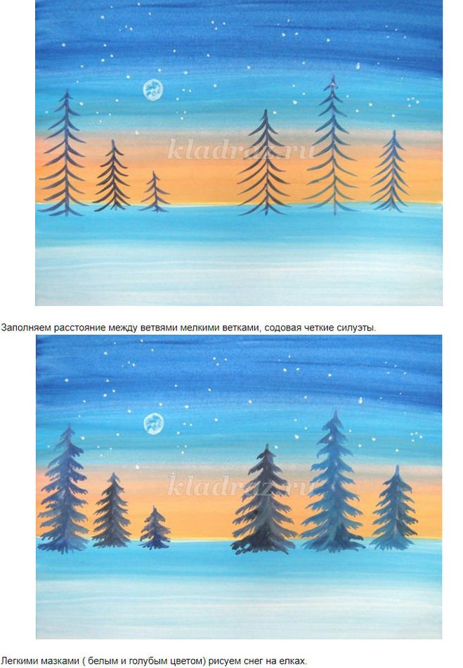 ![Зимний пейзаж гуашью для детей поэтапно]()