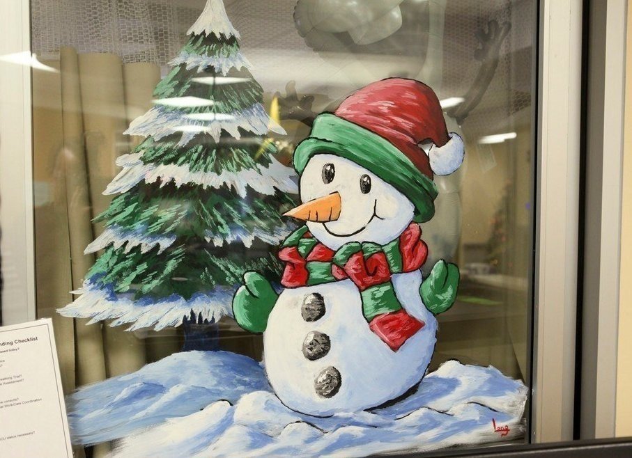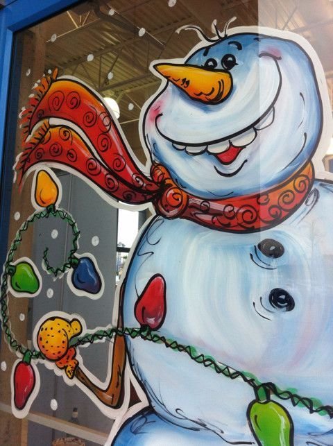![Снеговик Олаф на окне красками]()