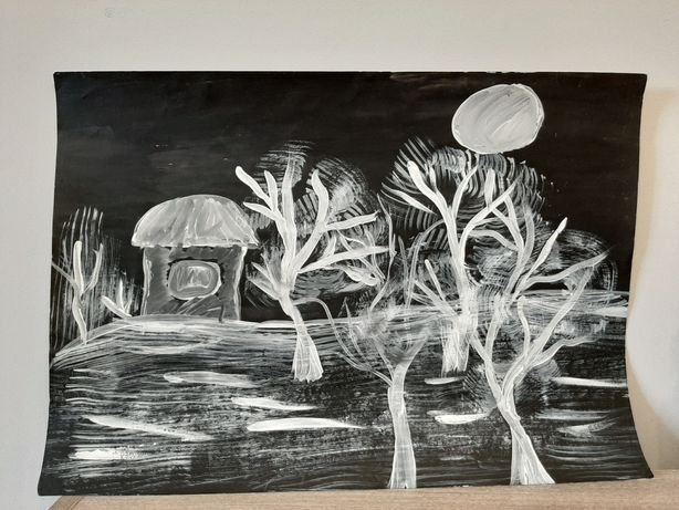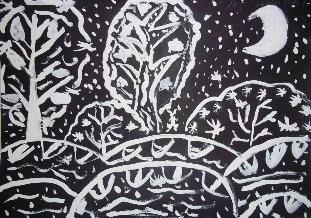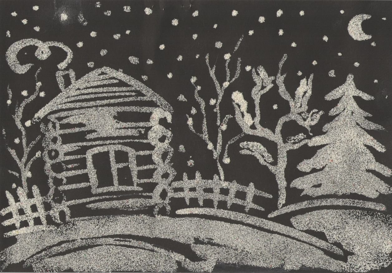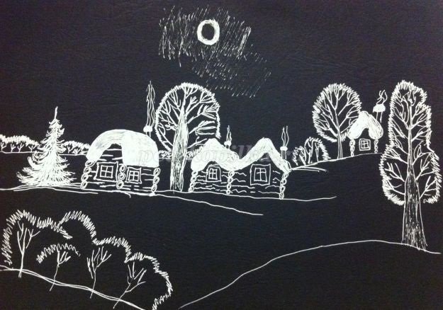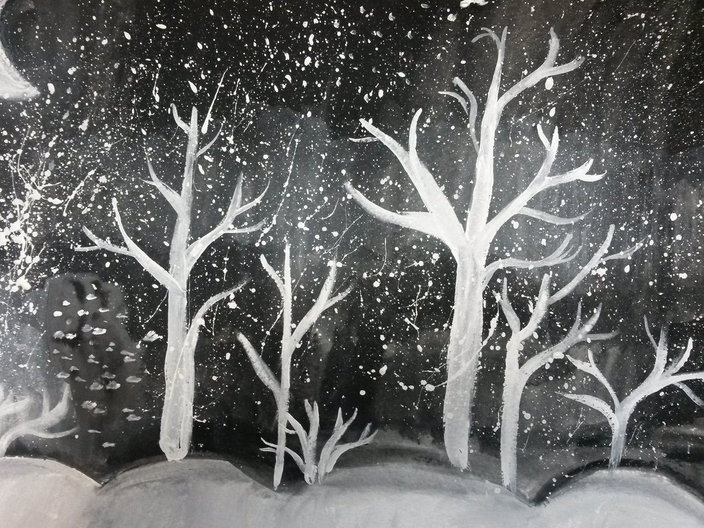 ![Зимний пейзаж белой гуашью на темном фоне]()
