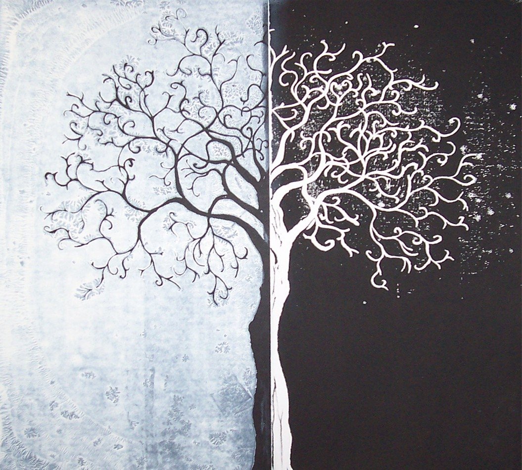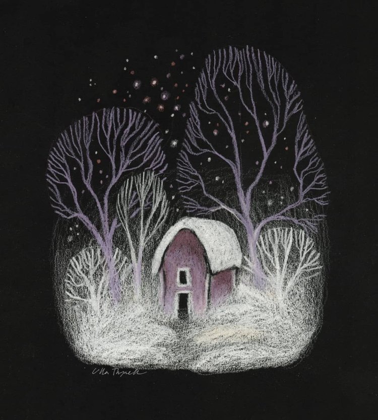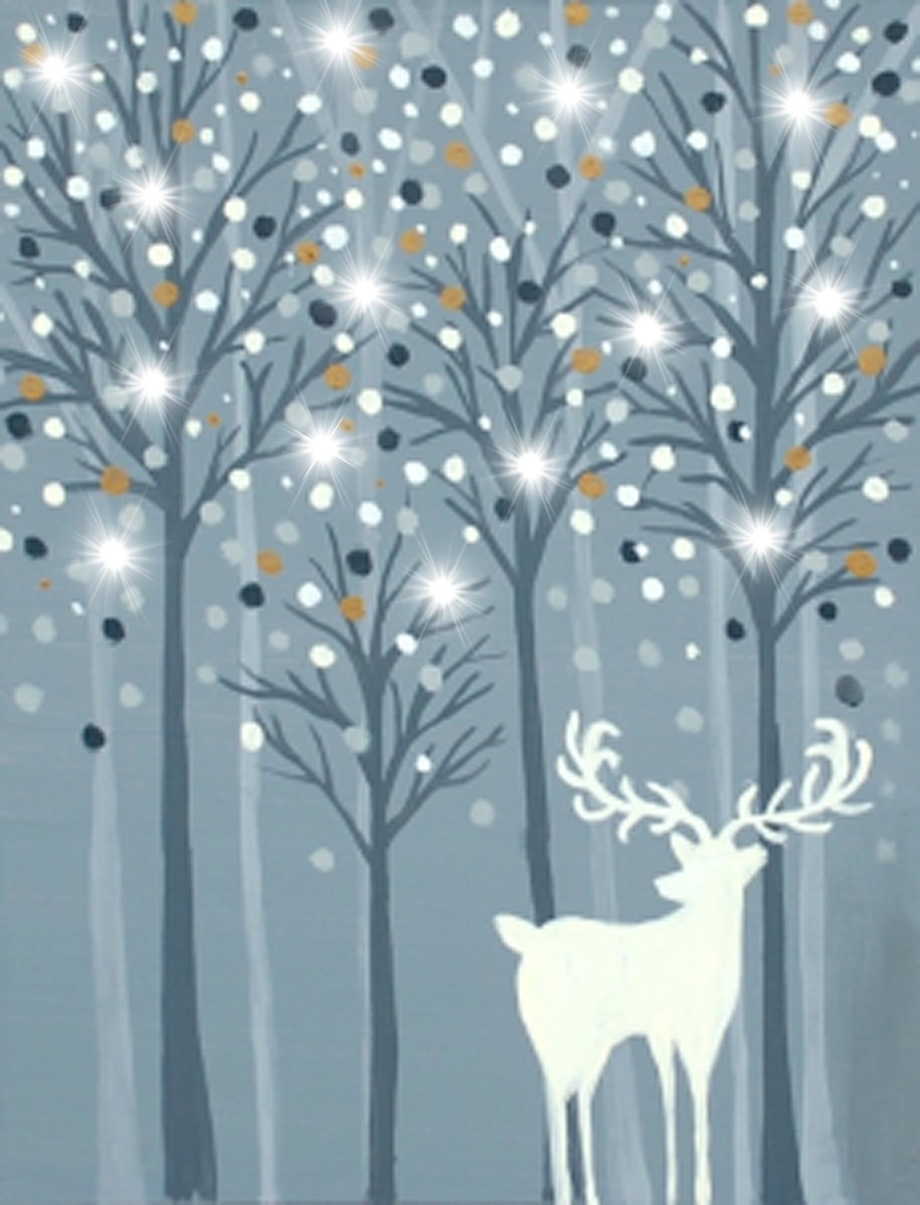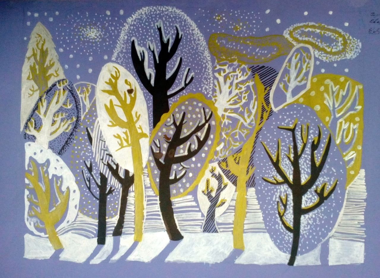 ![Зимний пейзаж белой гуашью на темном фоне]()