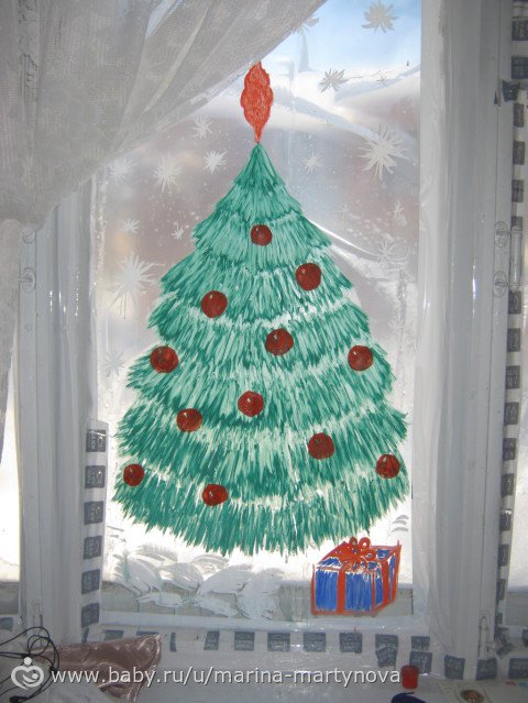 ![Елка на стекле гуашью]()