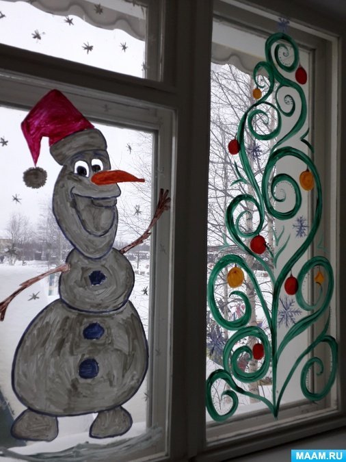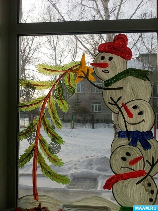 ![Снеговик на стекле гуашью]()