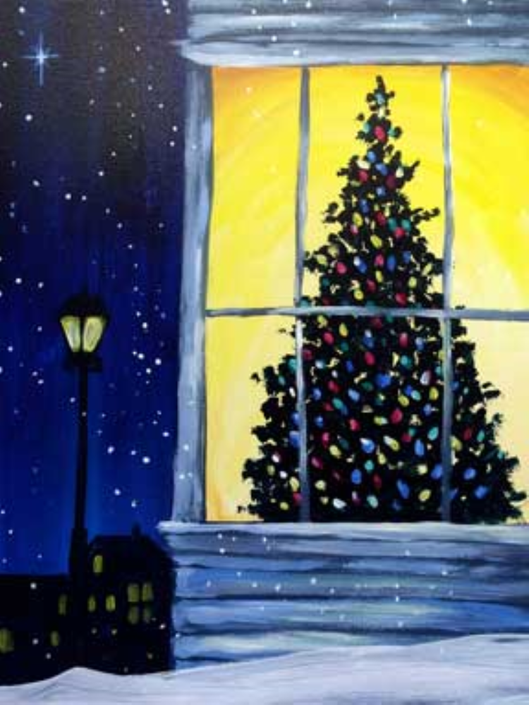 Новогодняя елка на окне гуашью