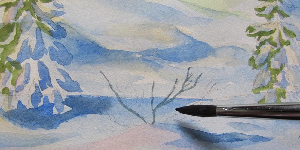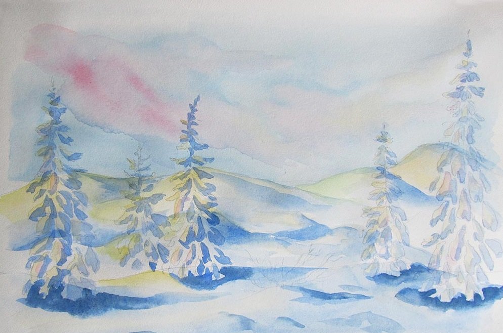 Зимний пейзаж акварелью для начинающих