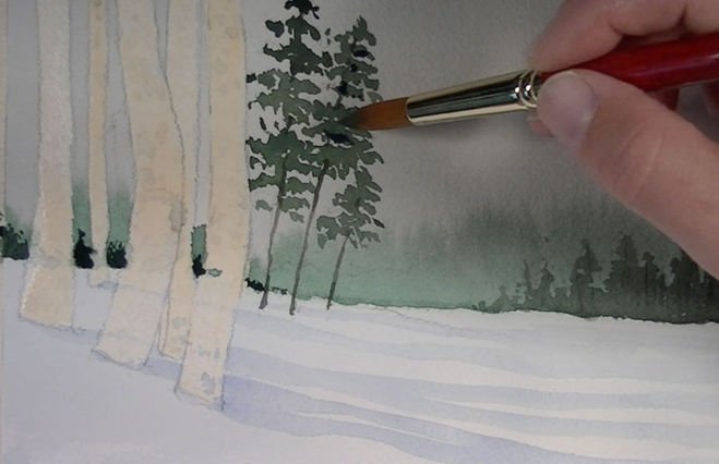 ![Уроки рисования акварелью зимний пейзаж]()