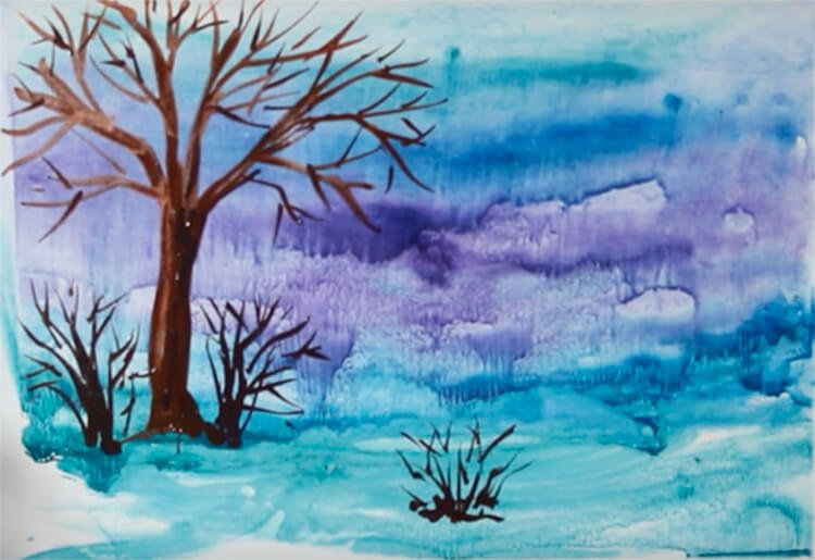 ![Зимний пейзаж акварелью для детей]()