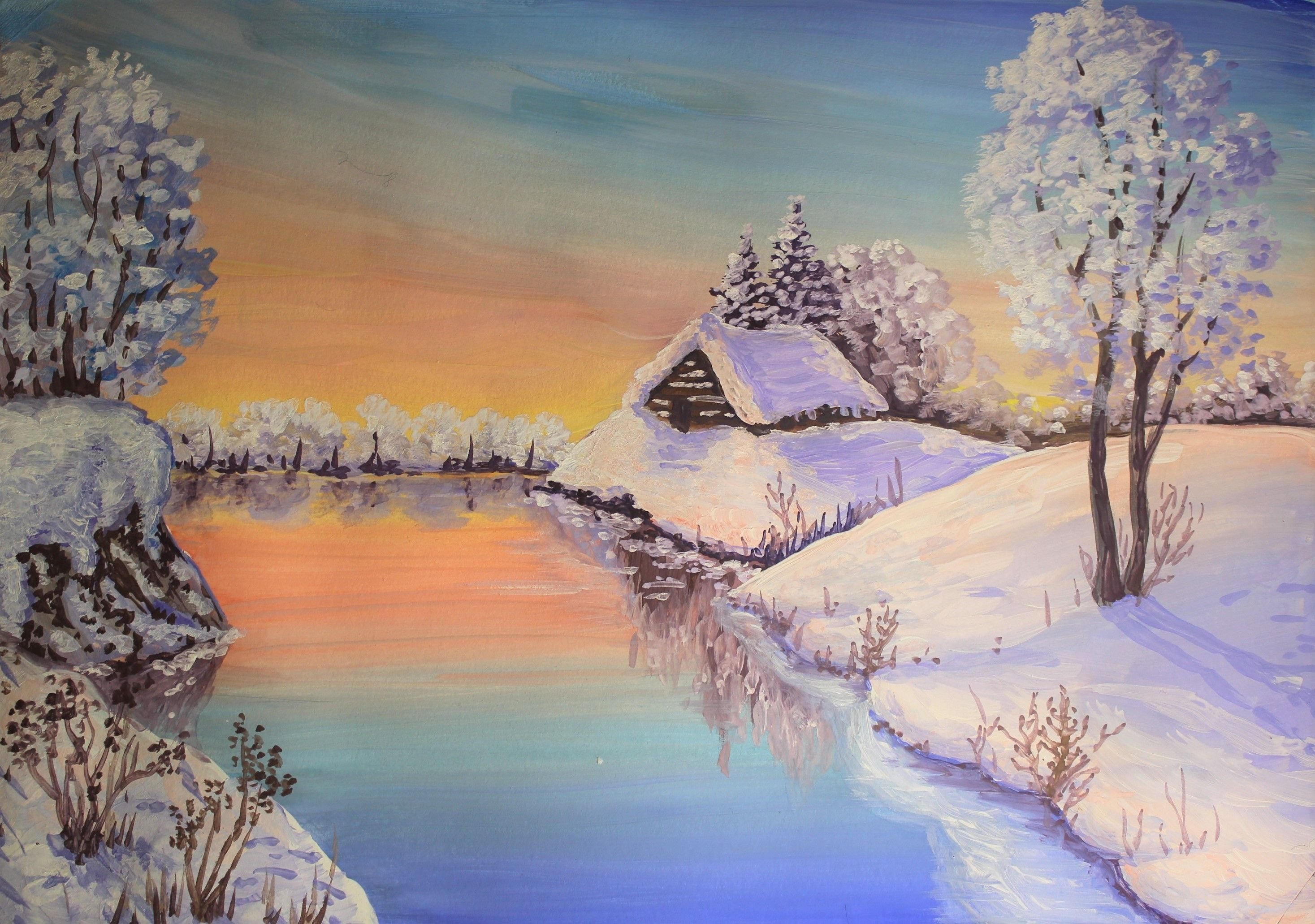 Зимний пейзаж гуашью