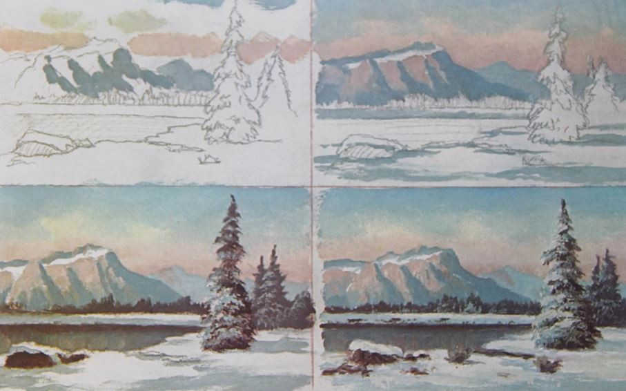 Этапы рисования зимних пейзажей акварелью