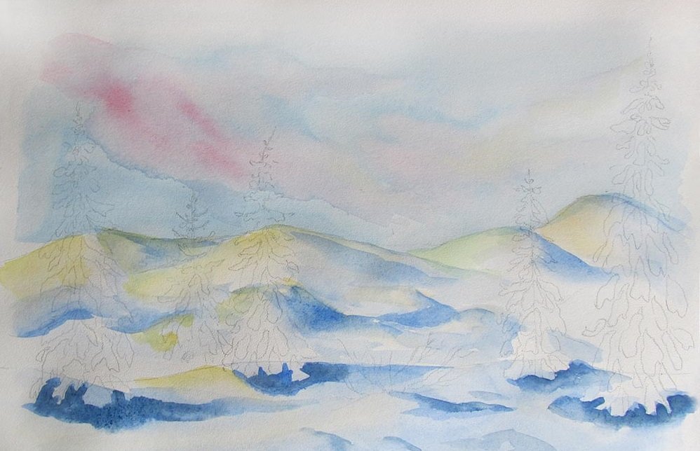 ![Зимний пейзаж акварелью поэтапно]()