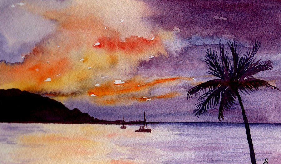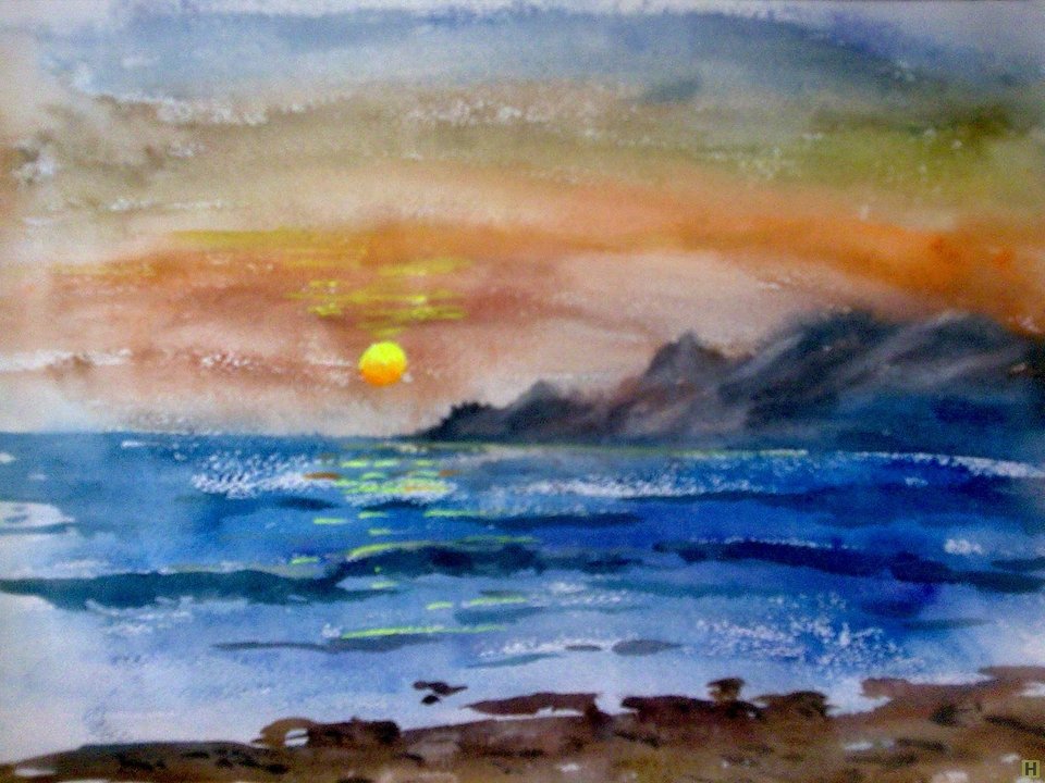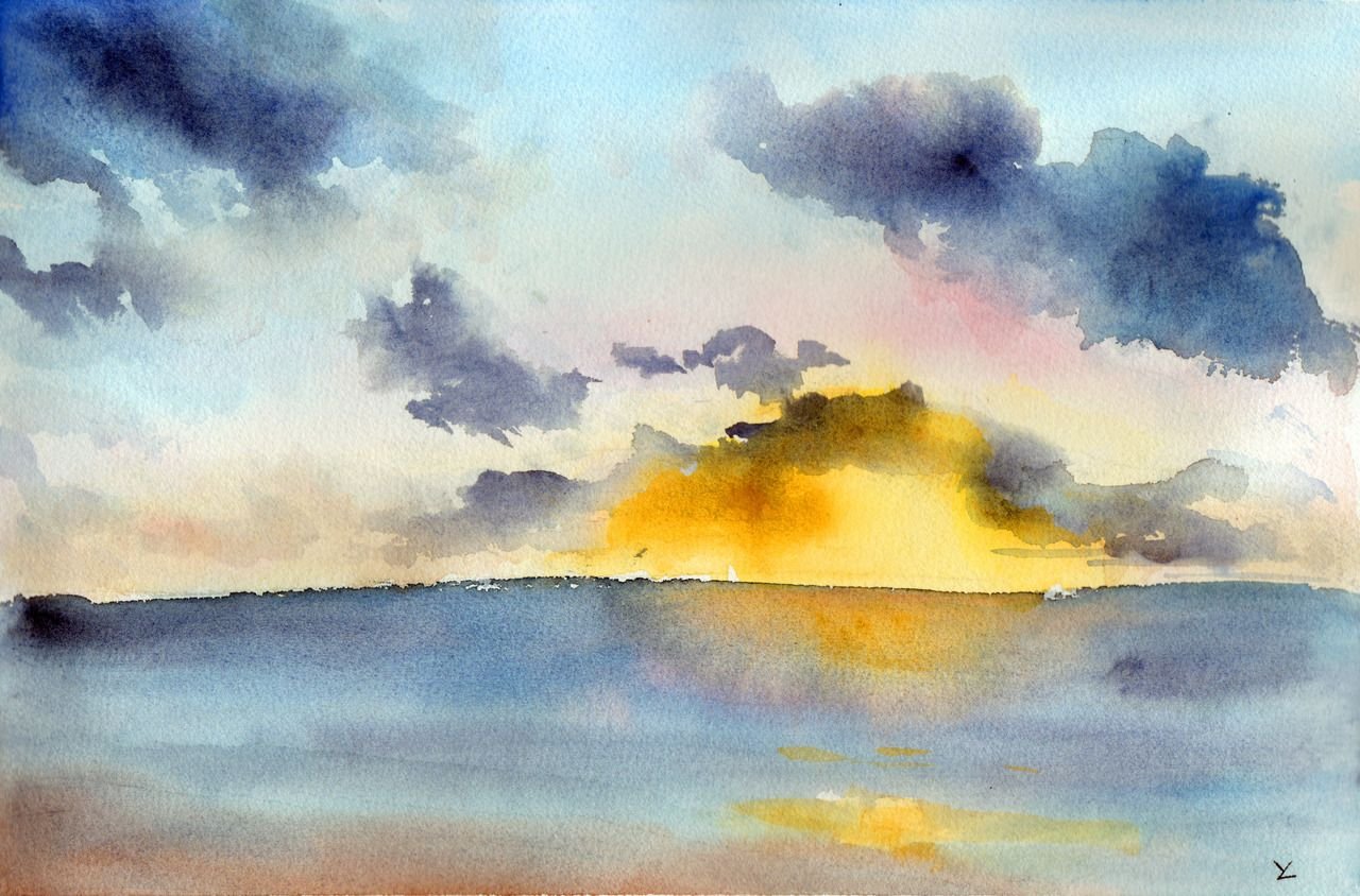 ![Морской закат акварелью]()