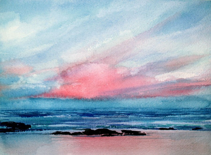 Морской закат акварелью