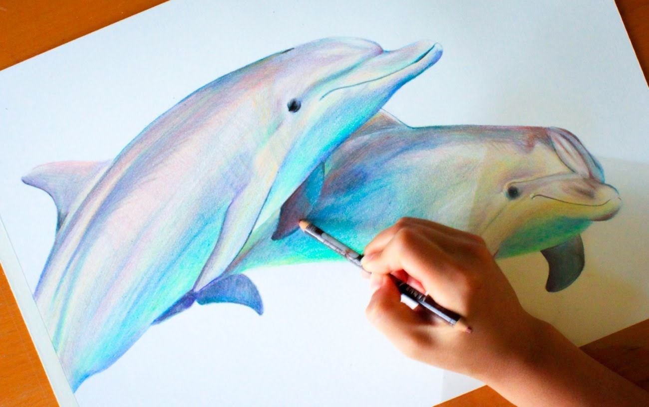 ![Рисунки цветными карандашами дельфины]()