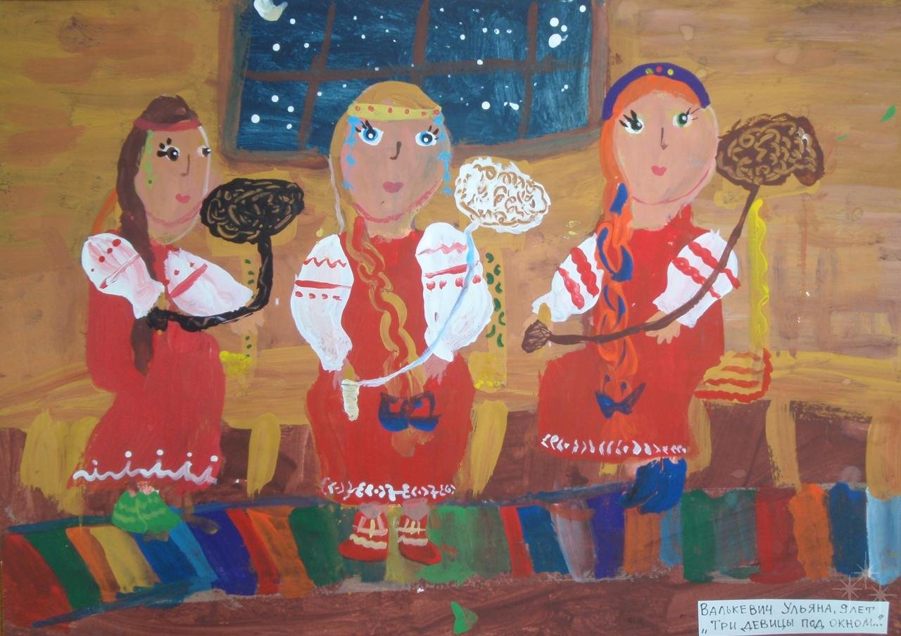 ![Три девицы под окном пряли поздно вечерком рисунок]()
