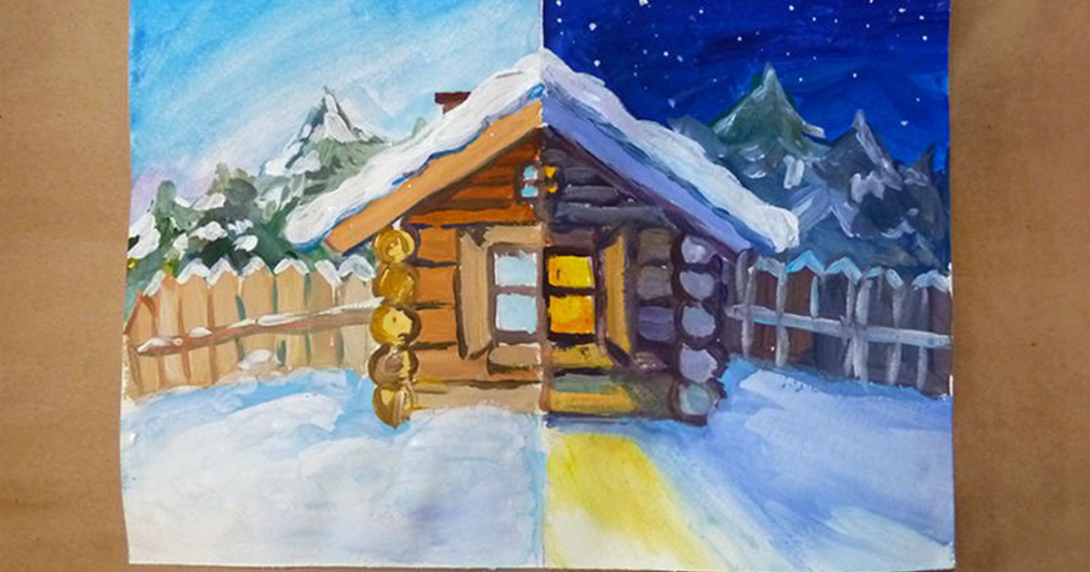 Зимний домик гуашью