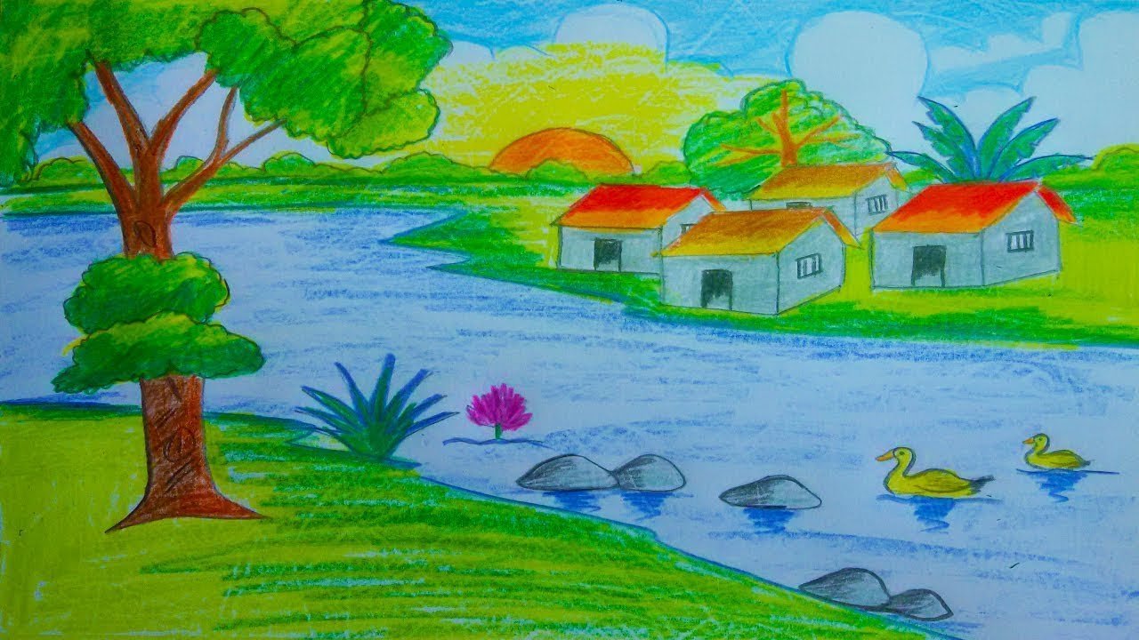 Пейзаж цветными карандашами для детей