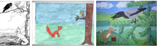 ![Иллюстрирование басни и. Крылова «ворона и лисица»]()