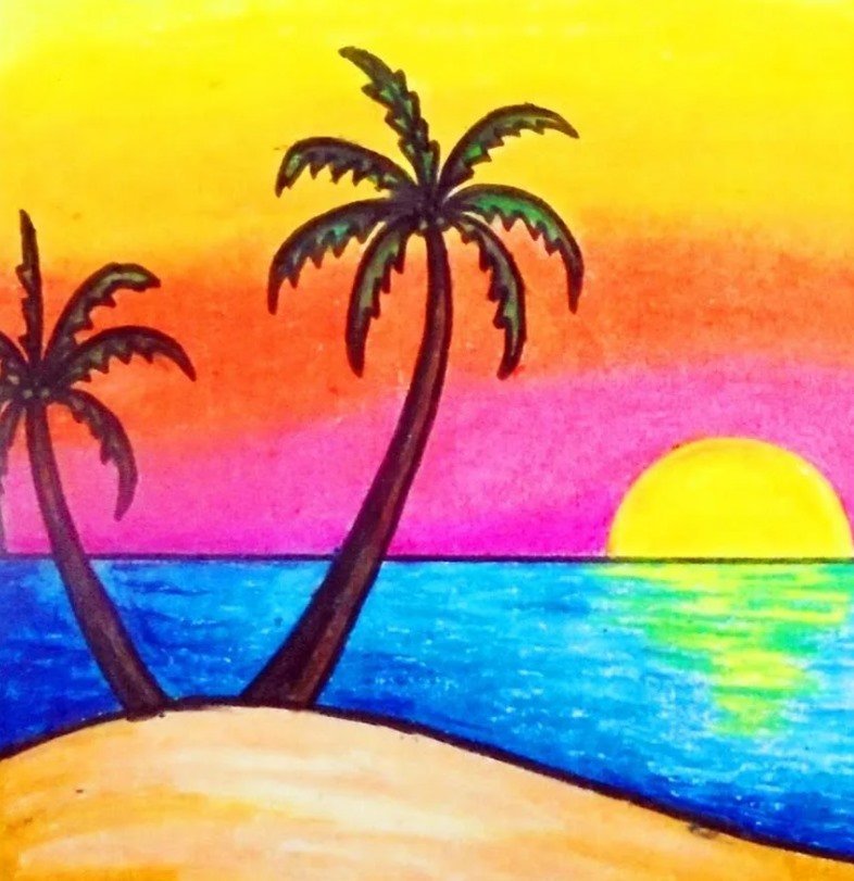 ![Пейзаж цветными карандашами для детей]()
