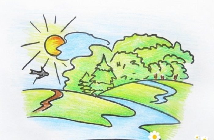 Пейзаж цветными карандашами для детей