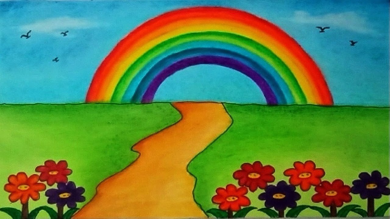 ![Пейзаж с радугой рисунок]()