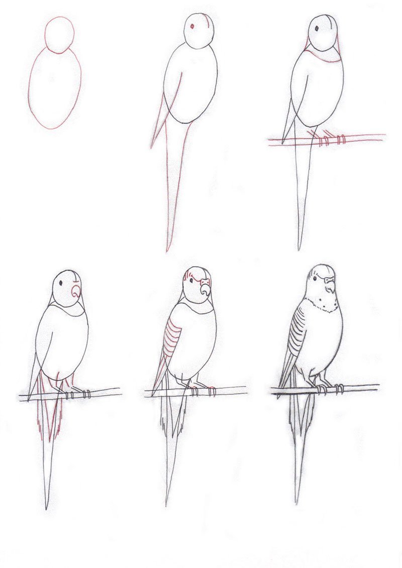 ![Поэтапное рисование волнистых попугаев]()
