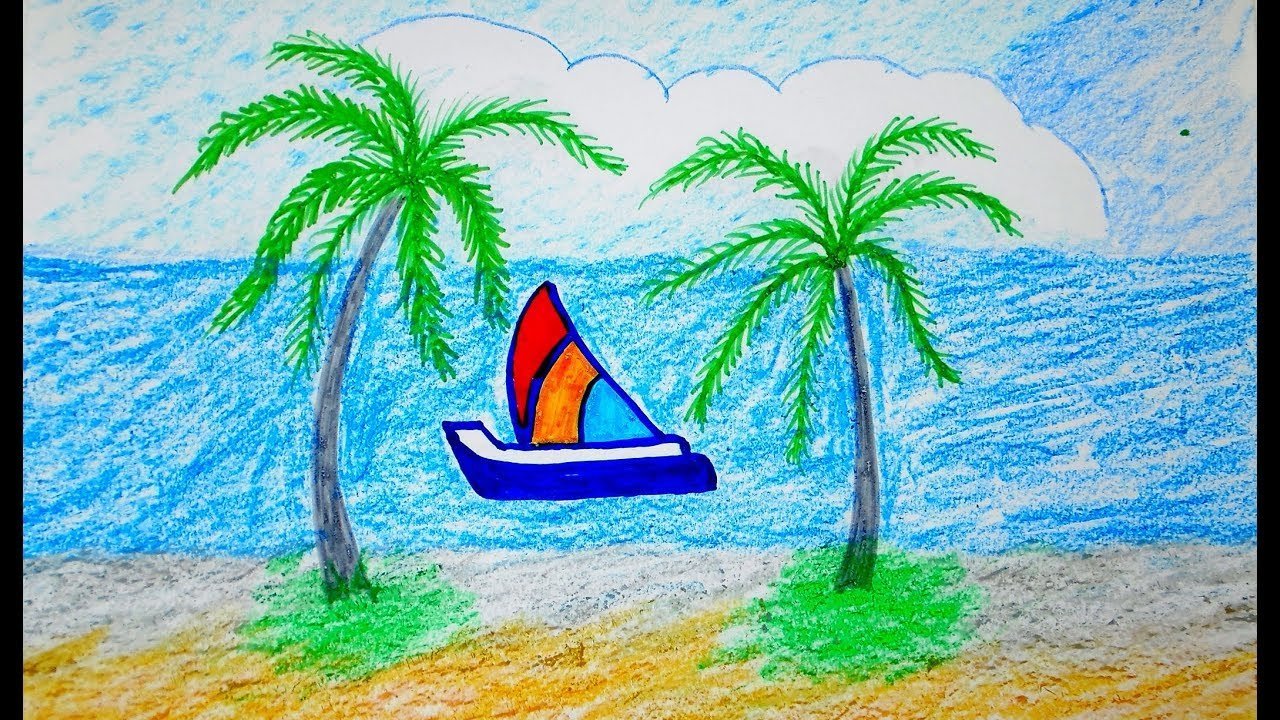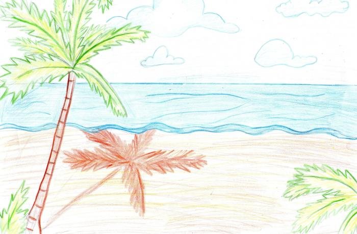 ![Детский пейзаж моря карандашами]()