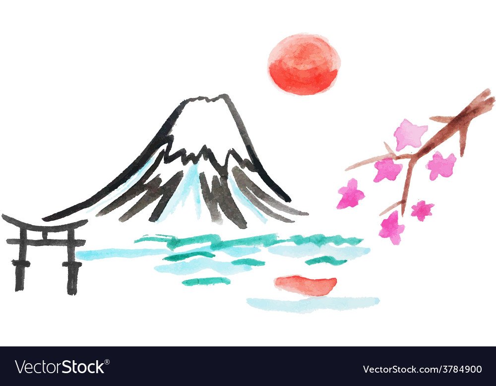 ![Японская традиционная Суми-э живопись. Гора Фудзи, Сакура]()