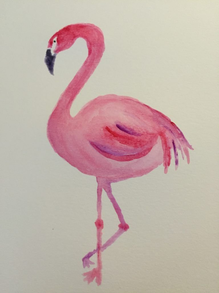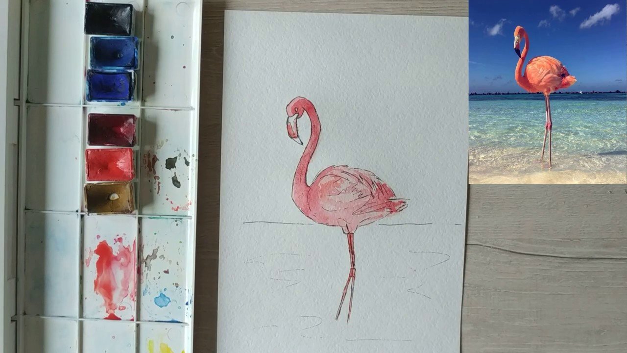 Фламинго красками акварелью
