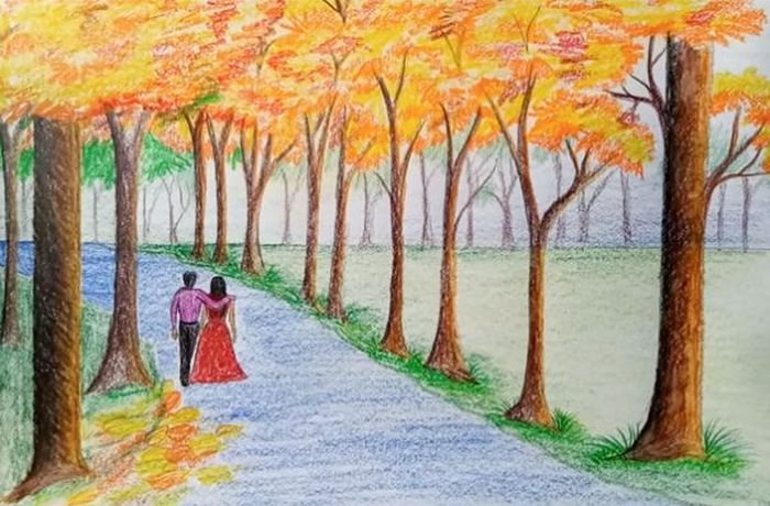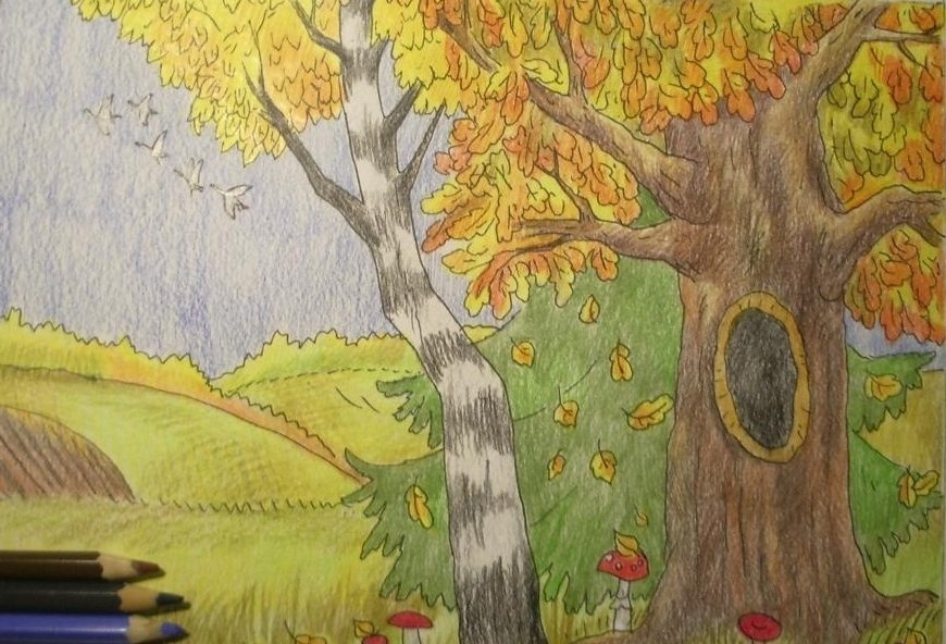 ![Осенний пейзаж цветными карандашами]()