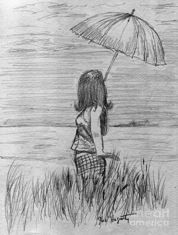 ![Девушка в платье весной под дождем рисунок карандашом легкий]()