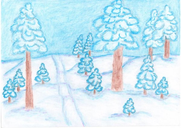 ![Зимний пейзаж цветными карандашами]()
