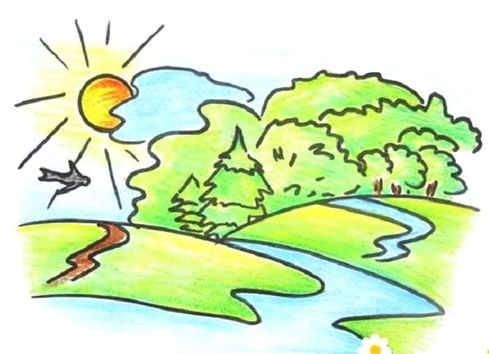 ![Пейзаж цветными карандашами для детей]()