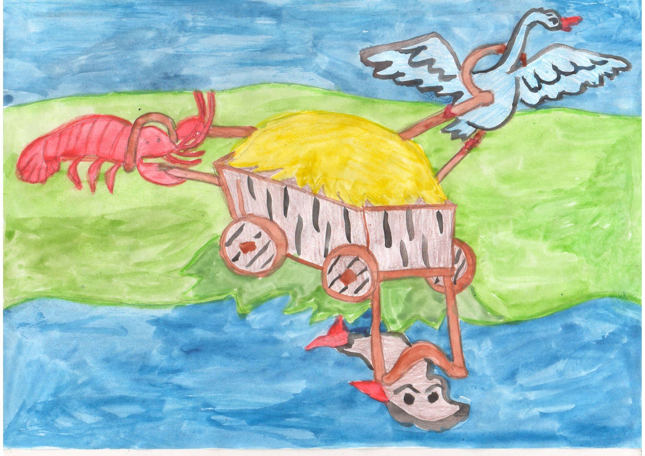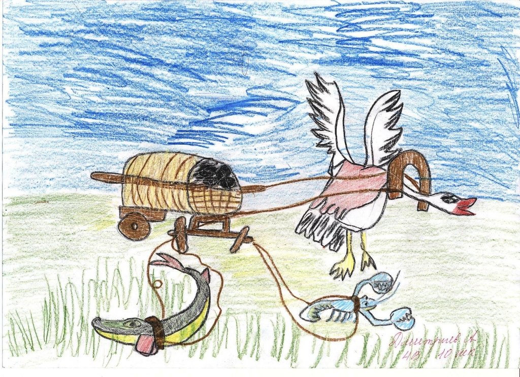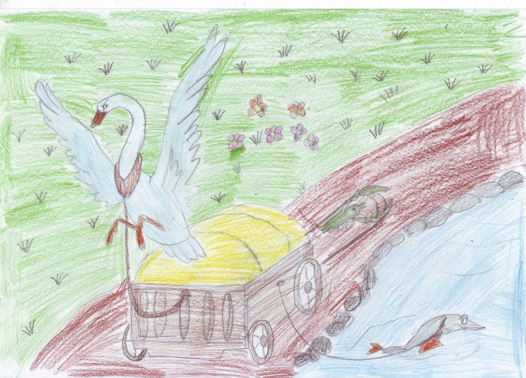 ![Рисунки лебедя и щуки]()
