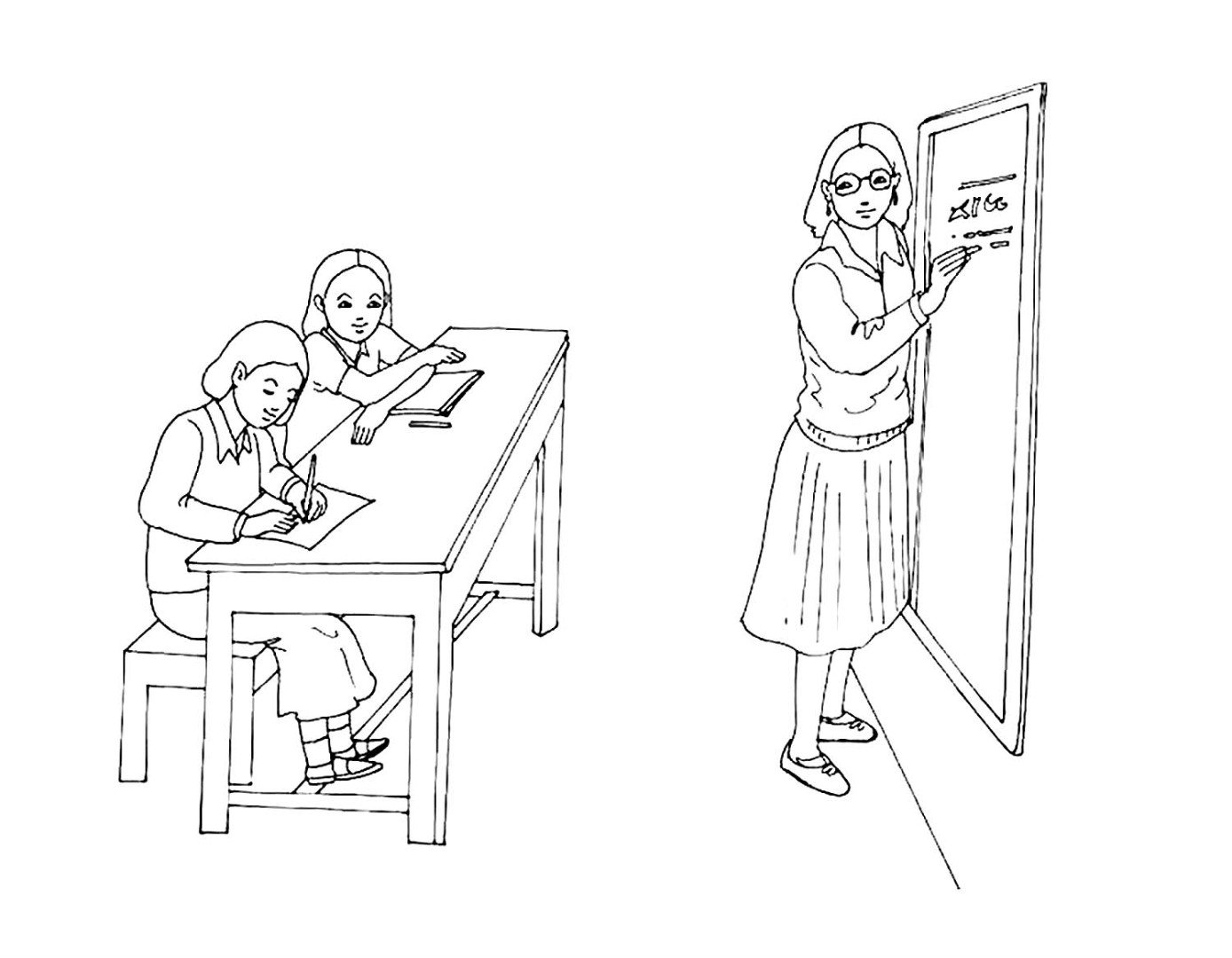 ![Дети на уроке раскраска]()