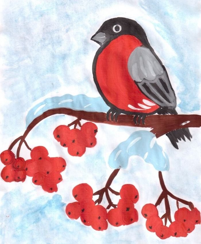 ![Снегирь на ветке рябины для детей]()