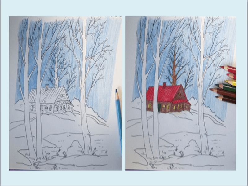 ![Зимний пейзаж цветными карандашами]()