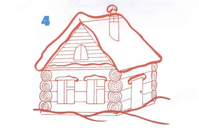 ![Поэтапное рисование избушки]()