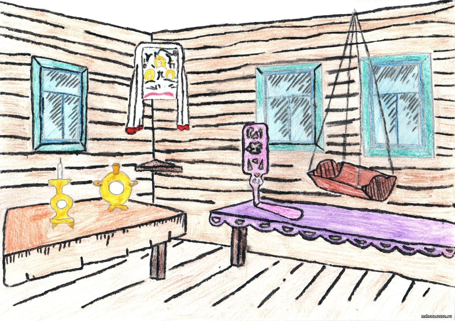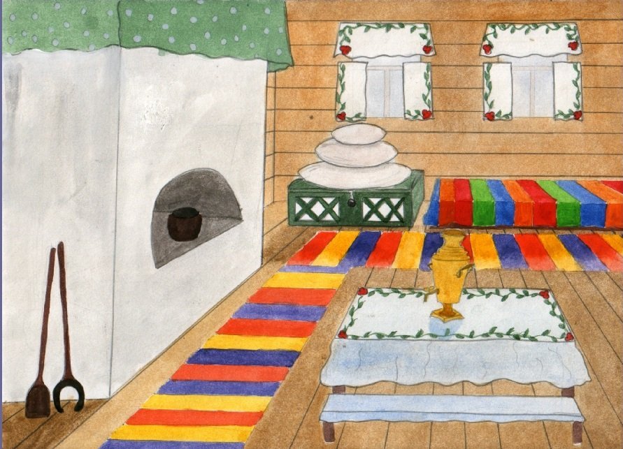 ![Эскиз убранства русской избы]()