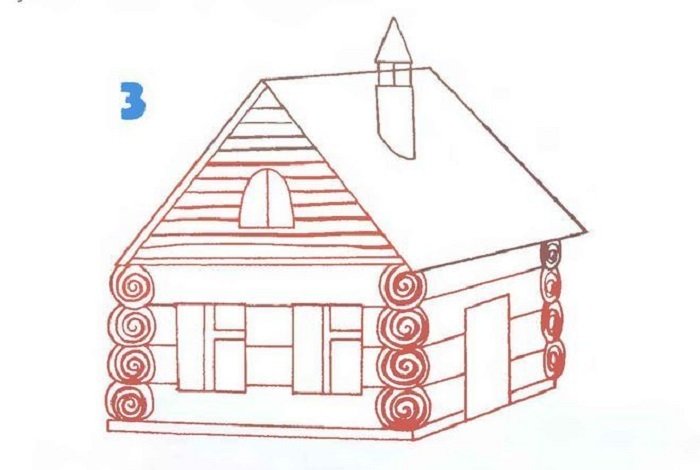 ![Этапы рисования избы]()