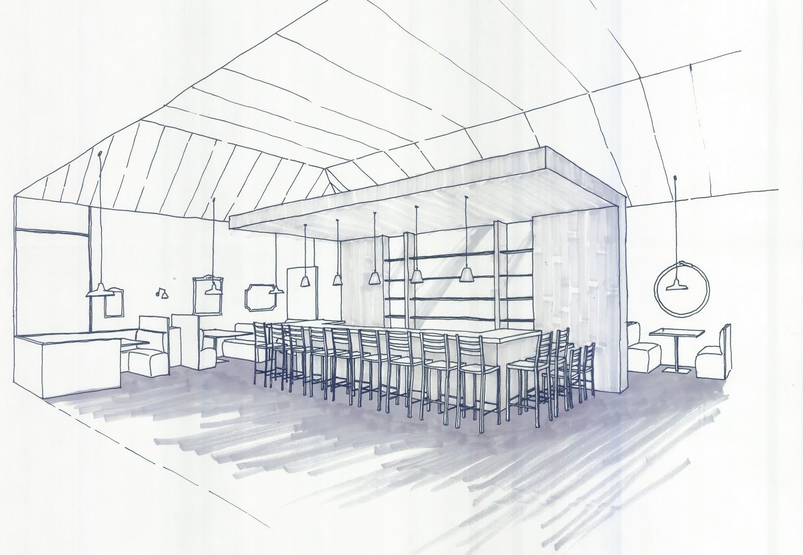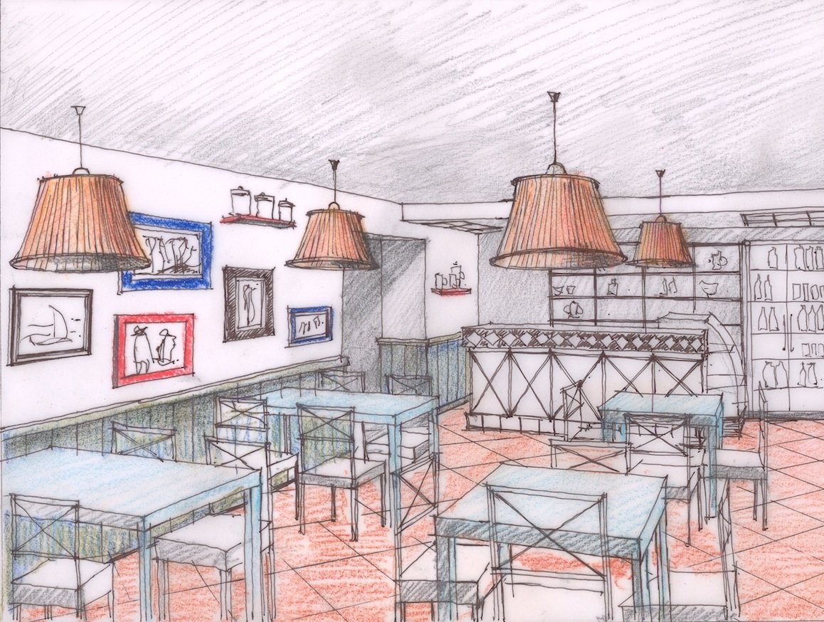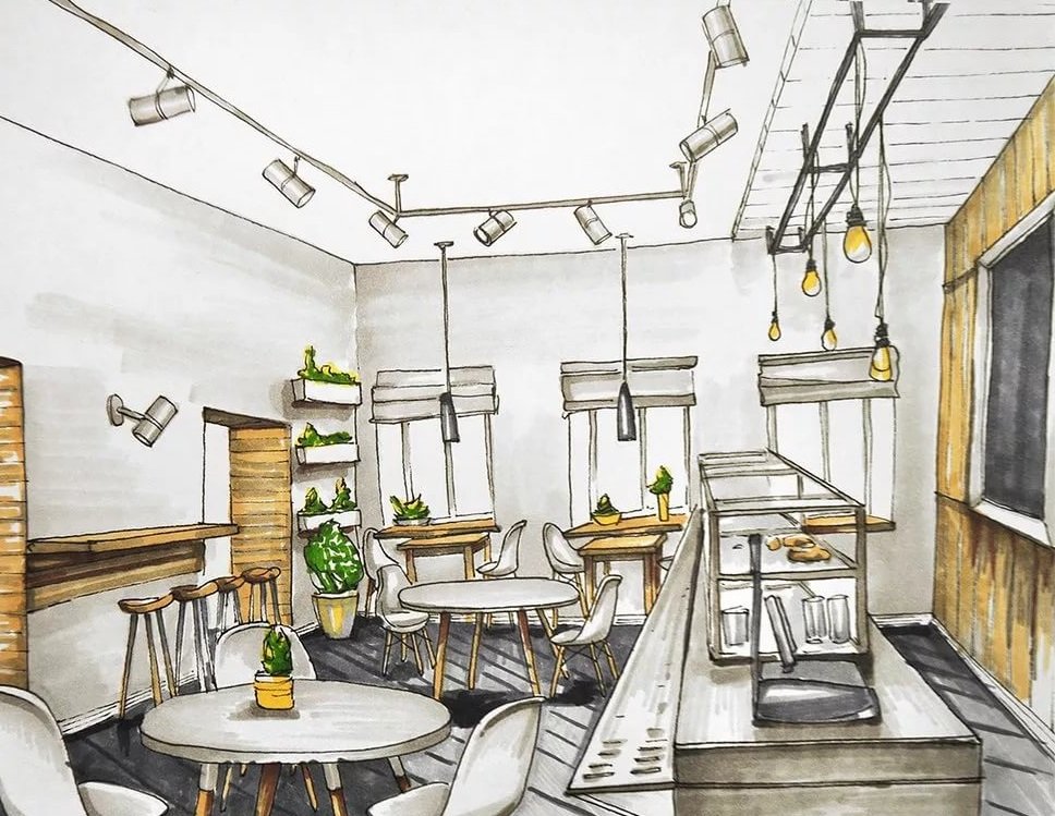 ![Зарисовки интерьера кафе]()