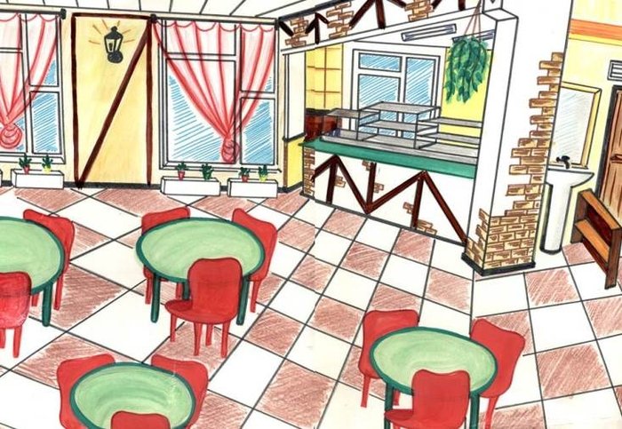 ![Интерьер кафе рисунок легкий]()