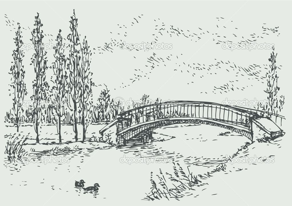 ![Пейзаж парка с рекой и мостом карандашом]()
