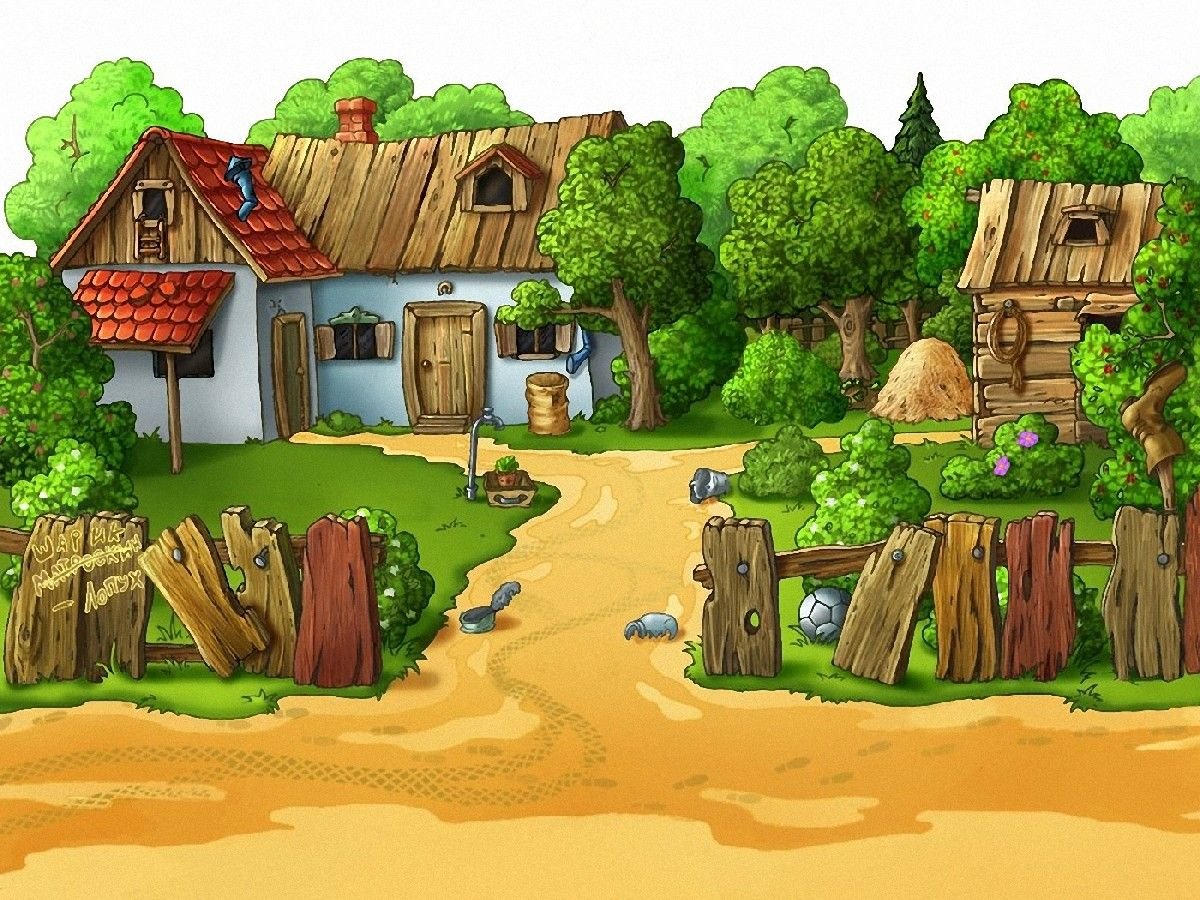 ![Домик в деревне в мультяшном стиле]()