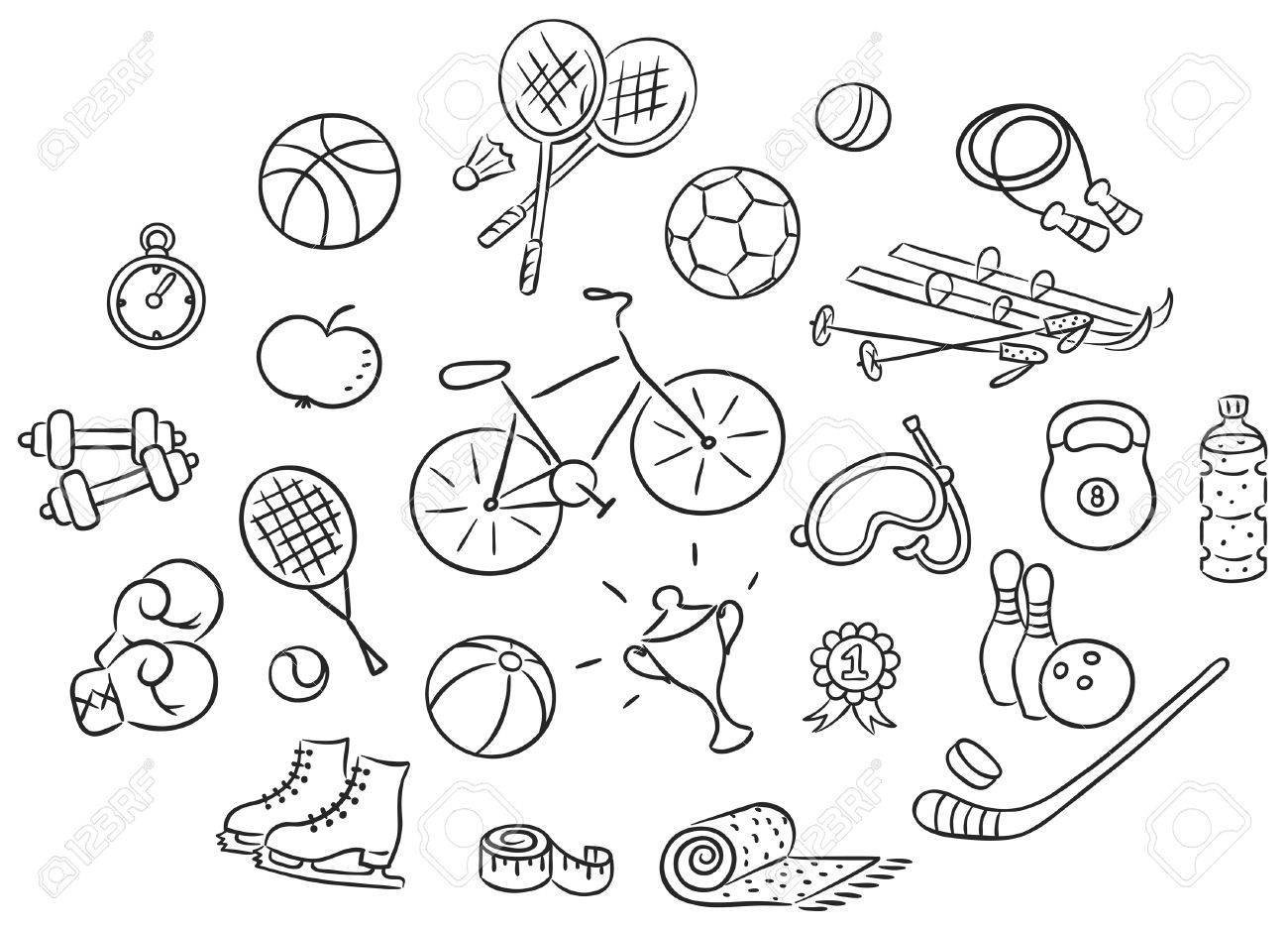 ![Спортивные принадлежности карандашом]()