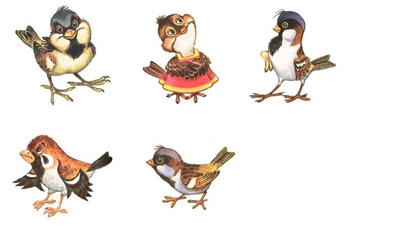 ![Воробьи мультяшные]()