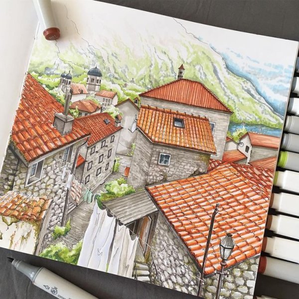 ![Пейзаж спиртовыми маркерами]()