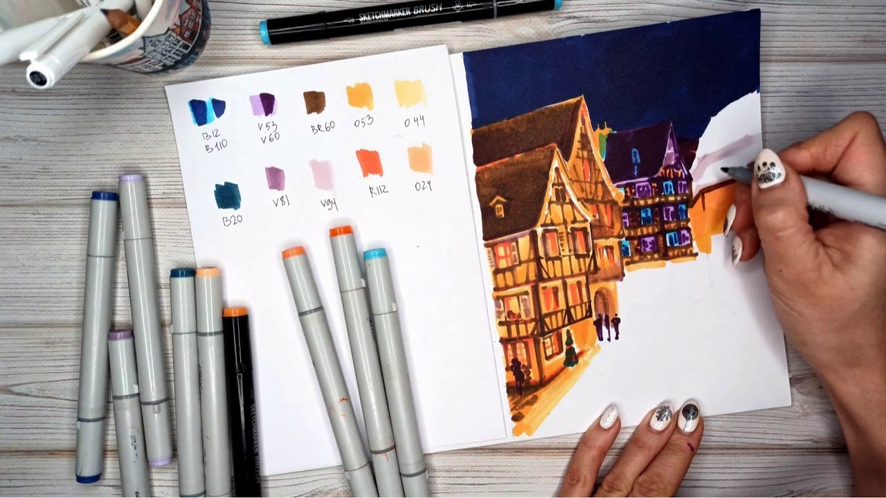 ![Пейзаж маркерами для скетчинга]()